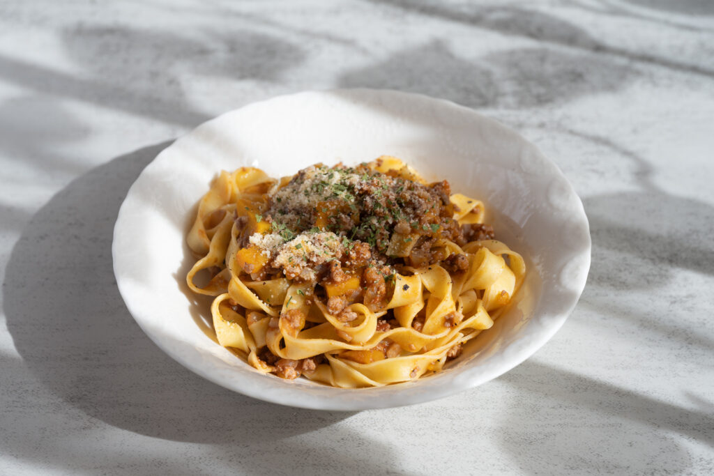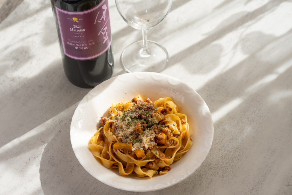 このワインに提案するペアリング料理は、ココアのほろ苦さとカボチャのやさしい甘味が溶け合った、ラグーソースのパスタです。ぜひ一緒にお楽しみください。
