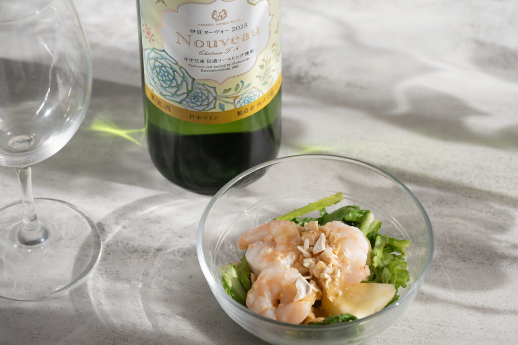 ヴィネグレットにも使ったリンゴの風味が、「伊豆ヌーヴォー白2025」の持つフレッシュな果実感と重なり合い、美しい調和を生み出します。メープルシロップの柔らかな甘味はワインの甘味と優しく溶け合い、そこに春菊の独特な風味がアクセントとして加わることで、味わいに心地よい奥行きが生まれます。さらに、ゴマの香ばしいコクやエビのうま味がワインのふくよかさと寄り添い、軽やかな中にも満足感のあるペアリングに。エビのプリプリとした食感とワインの軽快な口当たりも相性が良く、グラスがすすむ一皿です。