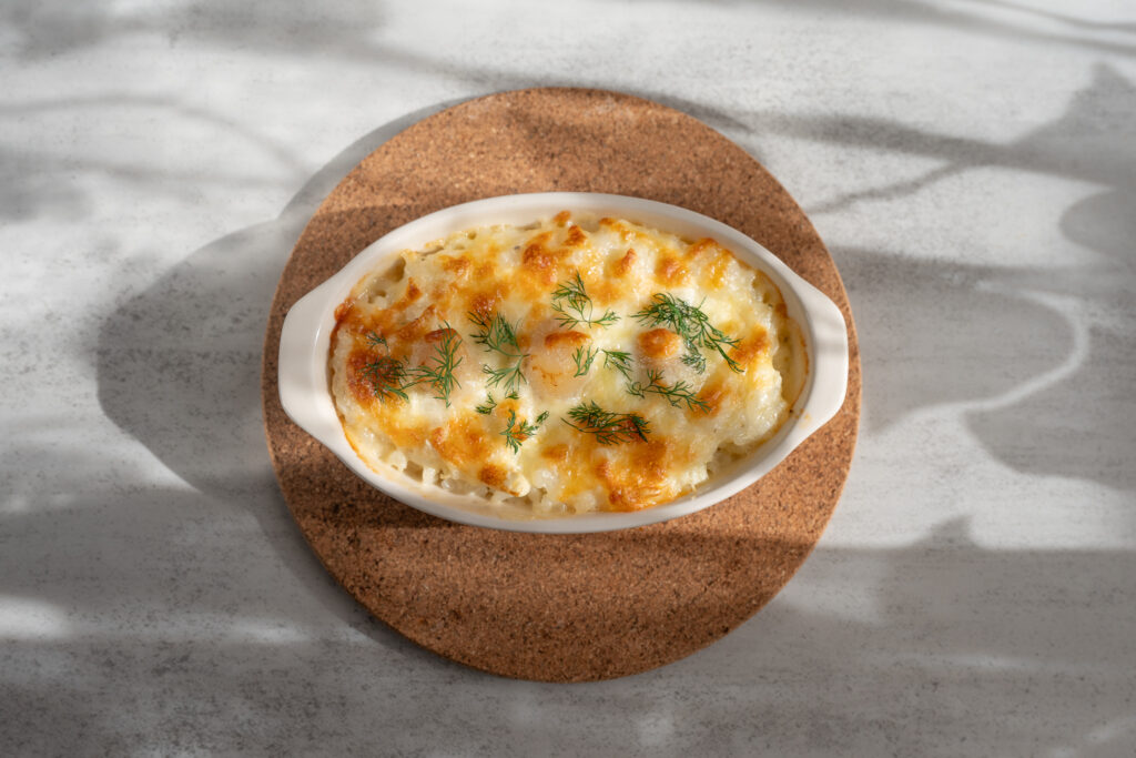9.オーブンでチーズに焼き色がつくまで焼いたら(約8分)、皿に取り出し、残りのディルを散らして完成です。