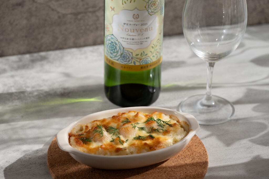 中伊豆ワイナリーでその年一番に産声を上げる白ワイン「伊豆ヌーヴォー白」。自社畑の信濃リースリングだけを使用したこの季節だけの味わいです。 グラスに注ぐと、グレープフルーツや黄桃の瑞々しい果実の香りに、レモンバームや白い花のアロマが重なります。まるでリンゴを頬張ったようなフレッシュな酸と甘味が広がるこのワインは、魚介料理との相性が抜群です。今回は、ホタテの香ばしさと、レモンやディルが爽やかに香る「焼きリゾット」とのペアリングをご提案します。旬の味わいをぜひ合わせてお楽しみください。