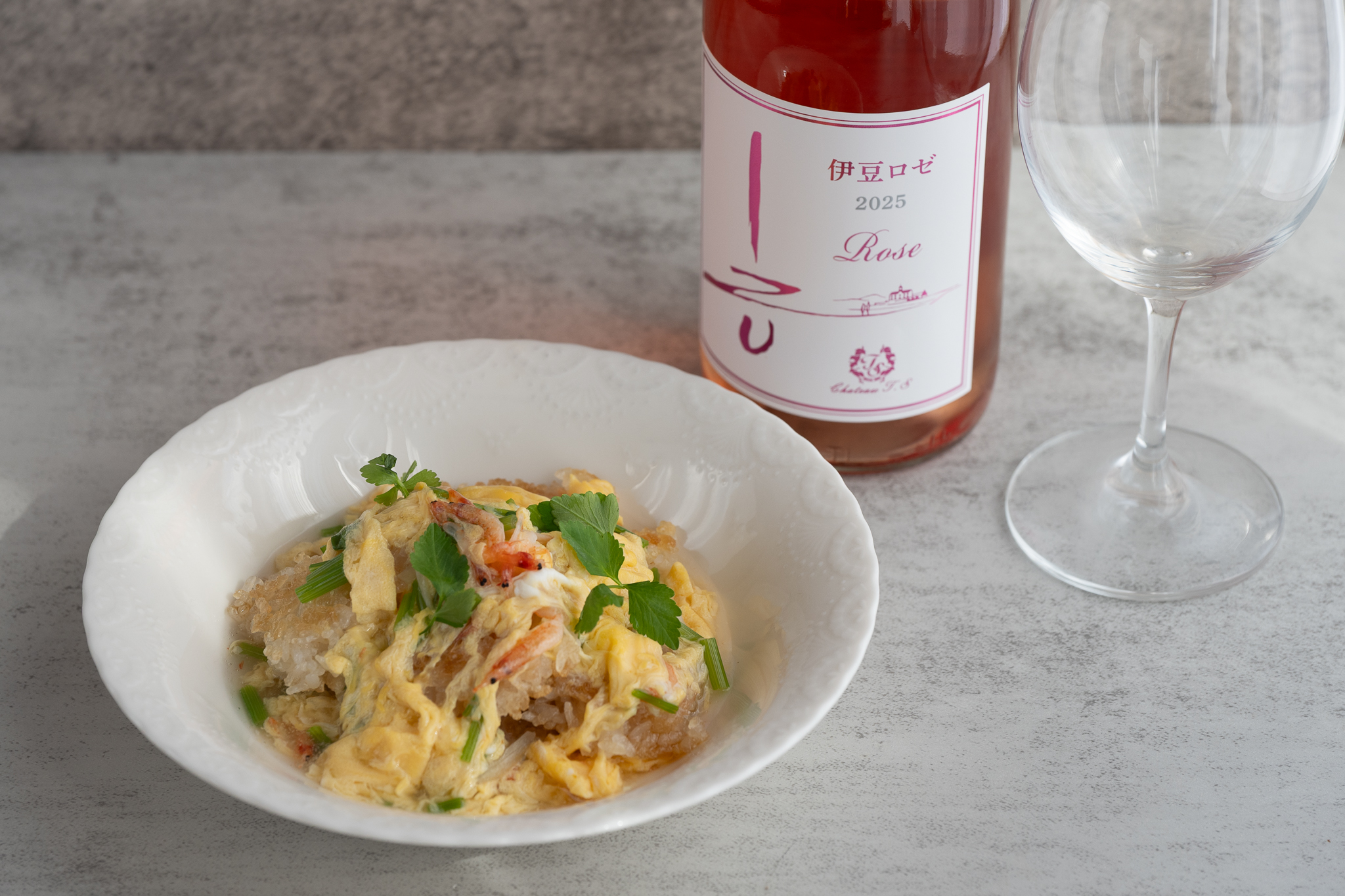桜えびのふくよかなうま味が「伊豆ロゼ 2025」のうま味と自然に重なり、口の中でひとつの豊かな味わいへと溶け合います。濃密なレッドチェリーのような香りを持つこのワインは、まるで調味料のように料理に寄り添い、ひと皿の完成度を引き上げてくれるでしょう。